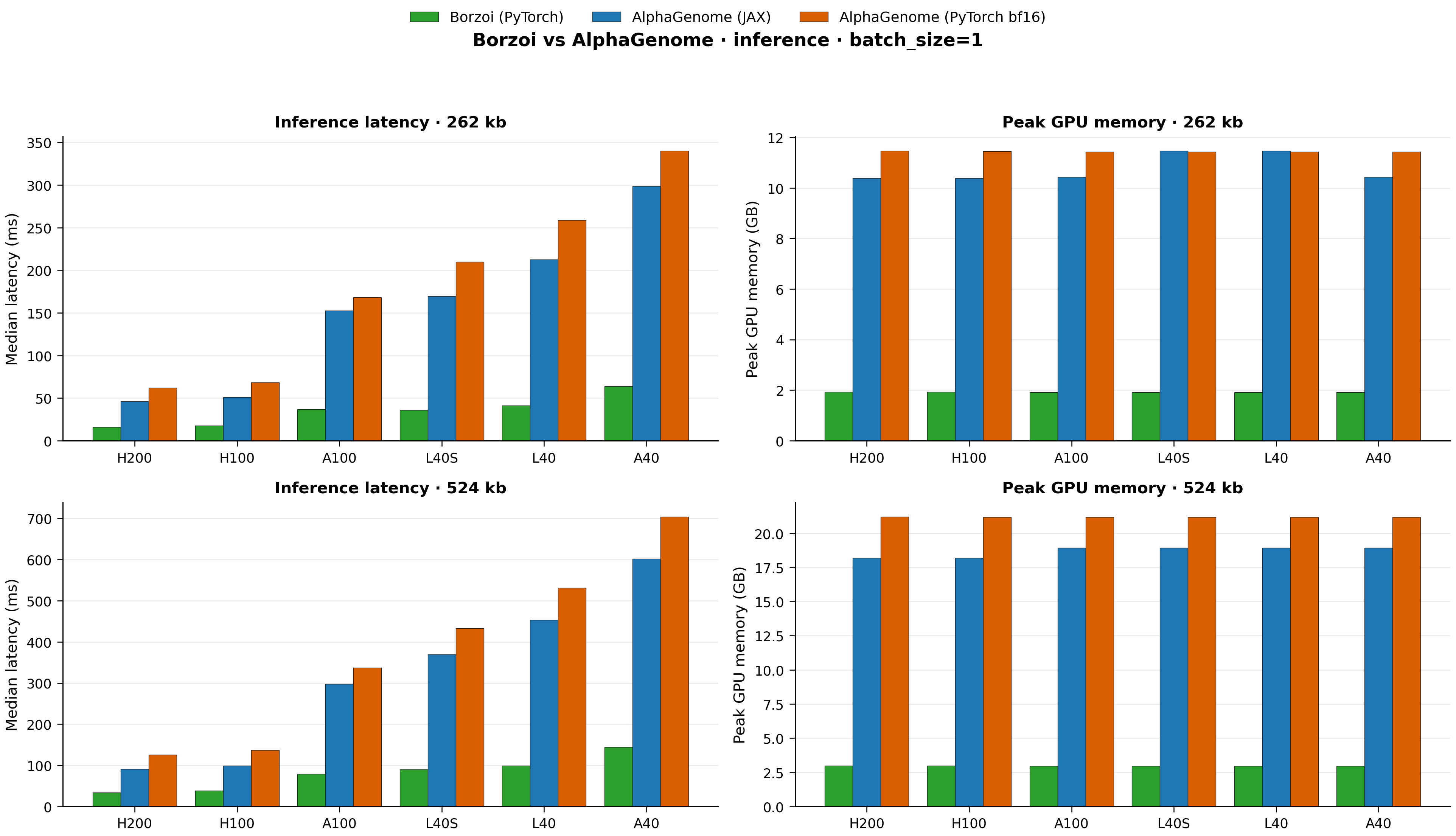 The same benchmark harness also profiles Borzoi (via the third-party borzoi-pytorch community port by Johannes Hingerl) at its supported 262 kb and 524 kb contexts. Borzoi is a useful reference because it is a much smaller model (~135M parameters vs AlphaGenome’s 450M), so it helps calibrate how much of the AlphaGenome latency is “foundation-model size” rather than anything implementation-specific.